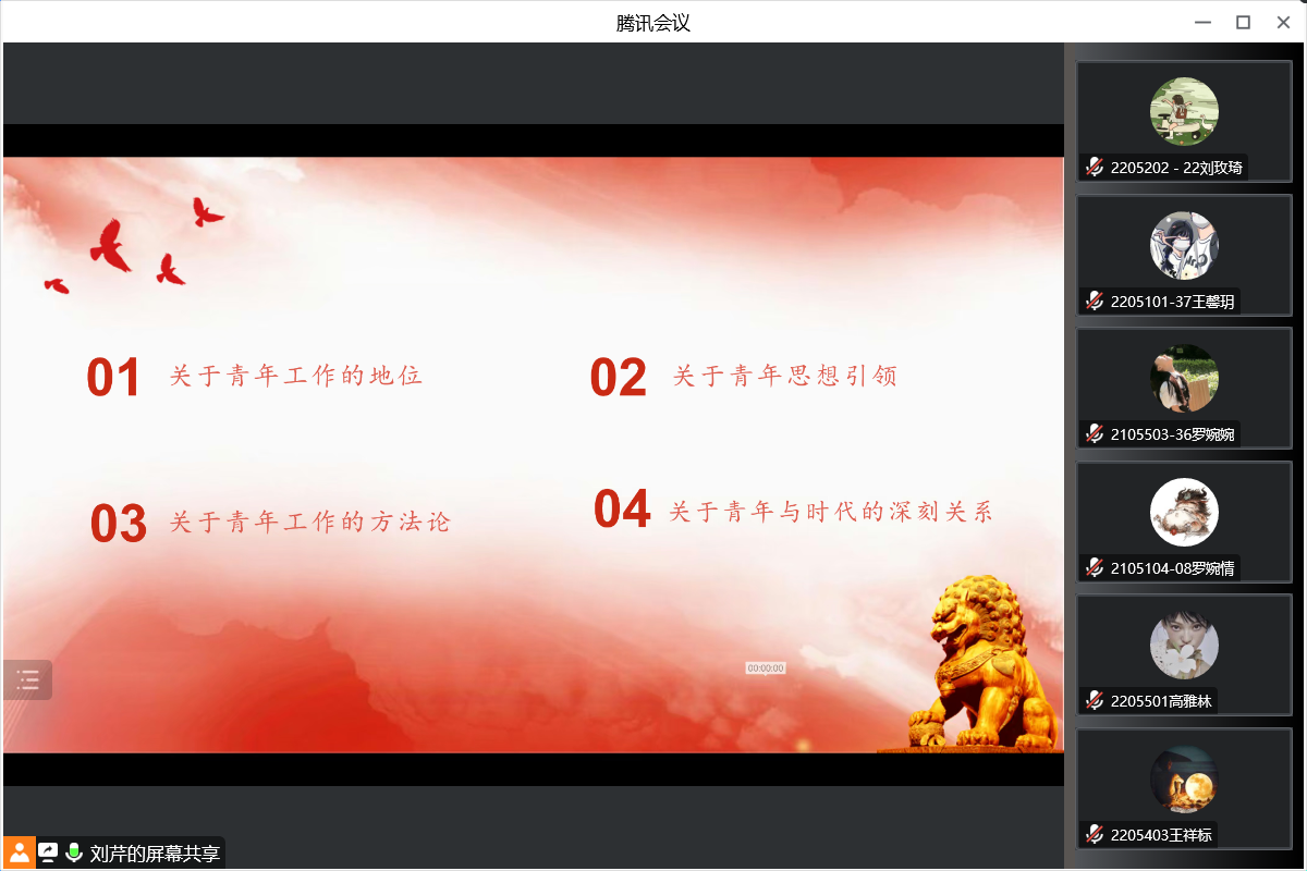 团课上,老师同学们一起重温了习近平总书记在党的二十大报告中关于青年工作的重要论述,论述文字精炼、内涵丰富、寓意深刻。刘老师就这段表述中所涵盖的的青年与时代的关系、青年工作的地位、青年思想引领的主要任务和内容、青年工作的方法论、对新时代青年的殷切期盼等方面进行了解读。