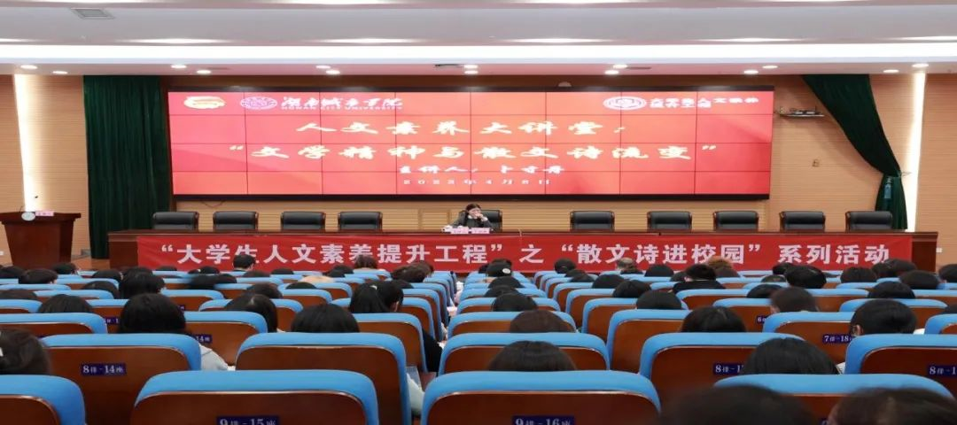蔚蓝的时代,文学艺术的长河永恒流淌,文学精神历久弥新。为更好提高大学生文学素养,传承文学精神,我校于4月8日晚上7:30在图书馆报告厅举办了人文素养大讲堂之《文学精神与散文诗流变》,主讲人是中国诗歌学会理事、湖南省作家协会全委会委员、散文诗杂志社总编辑卜寸丹教授。益阳市人大常委会党组成员、副主任,益阳市总工会主席杨丽萍,益阳市人大常委会研究室、国学推广人徐亮亮,益阳师专、阅读推广人贾丽云,学校党委委员、副校长袁志成、团委书记王琦,必赢线路检测3003no1党委副书记王传浩,团委副书记李琳等出席。