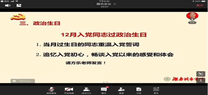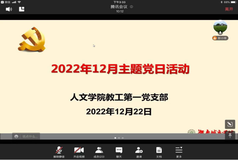 2022年12月22日下午,学院教工第一党支部由支部书记彭小球主持采用线上线下结合形式举行“一课一片一实践”主题党日活动,开展党的二十大精神宣讲和《党章》修正案学习。学校雷存喜副校长和支部全体党员参加活动。
