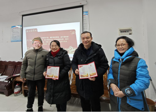 其后,为进一步强化党员身份意识和责任意识,落实党员“政治生日”制度,切实增强党内政治生活仪式感,支部为雷存喜、曾娟两位同志过政治生日:1)重温入党誓词。全体党员在雷存喜、曾娟同志的带领下,庄严宣誓,重温入党时的初心和使命。