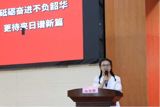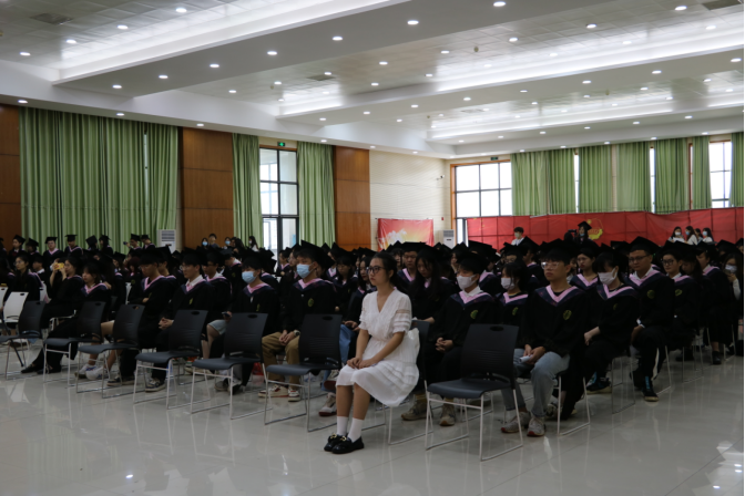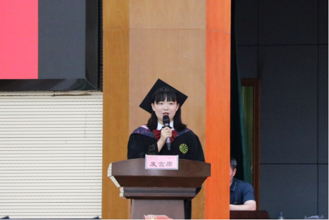 毕业生代表姜颖同学发言,衷心祝愿毕业学子们能将大学所得化为前进的力量,在工作中承担起青年人的使命与担当,并且铭记品学兼修、知行统一的校训。