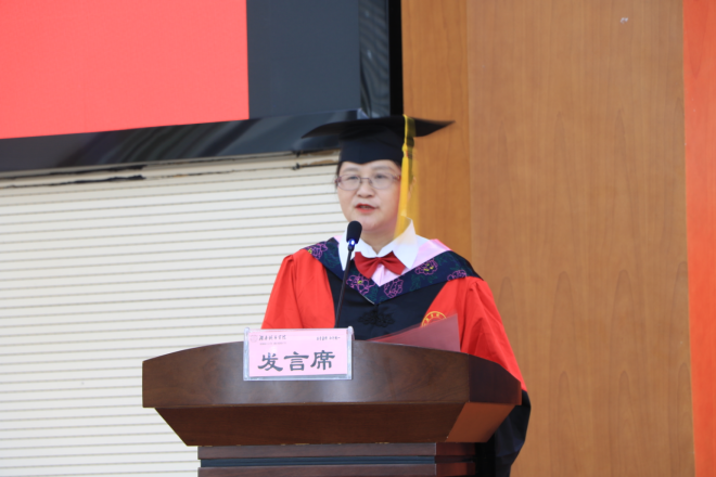 在雄壮的国歌之后,傅建安院长向2022届毕业生致辞,她认为这几年大家所共同经历的是一个从无到有到多的过程,师生共同奋斗的身影和无数的日夜绘成了如今这一幅最美的画卷,她还嘱咐即将踏入追梦征程的学子要珍存人文情怀、坚守人生底线,祝愿每一位人文学子一路顺风,前程似锦。