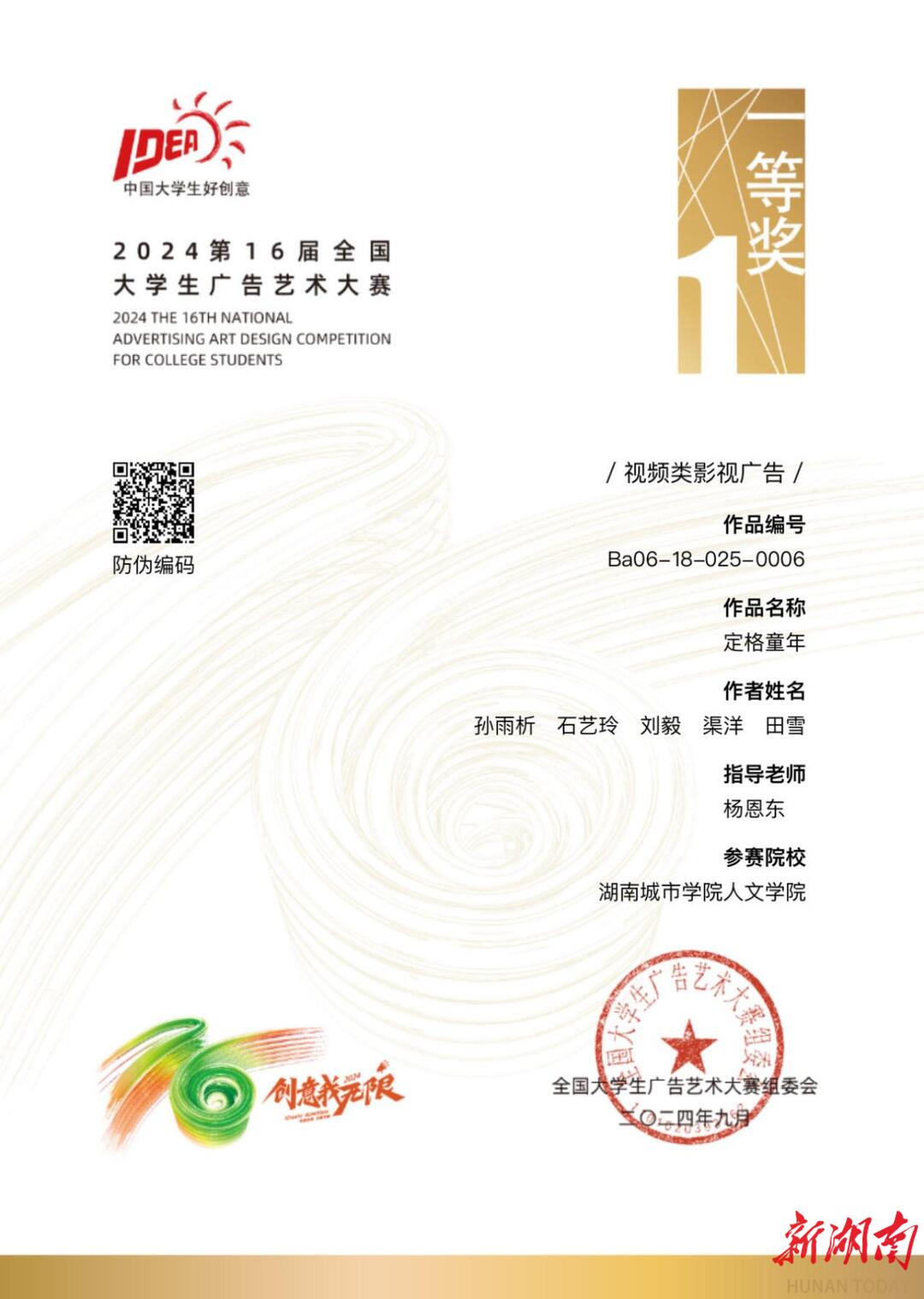 湖南日报·新湖南客户端9月19日讯(通讯员 刘力嘉)近日,第十六届全国大学生广告艺术大赛全国总评审结果公布,湖南城市学院获得全国一等奖1项,二等奖5项,三等奖10项,优秀奖5项。在此次比赛中,该校获奖数量取得重大突破,获奖作品类型涵盖多个方面。