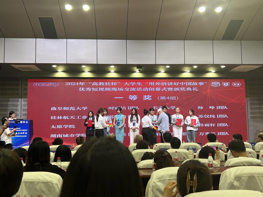 据悉,本次大赛吸引了来自全国919所本科院校的5053件作品参赛,经过校级和省级选拔,最终有29个省的96所高校共146件作品晋级全国交流活动,最后18项作品获得特等奖,54项获得一等奖,74项作品获得二等奖。我校汤佳等同学的短视频作品在胡帅、文巧平两位老师的指导下经过反复修改完善,先后在校级、省级比赛中脱颖而出。本次省级比赛由湖南省外事办、湖南省委教育工委、湖南省教育厅联合主办,全省本科组共提交170余件参赛作品中,汤佳团队作品获得省级一等奖,并被推荐参加全国决赛。在全国赛中,再度凭借其独特的视角和感人的故事打动评委,荣膺一等奖,胡帅老师获得全国“优秀指导老师”称号。