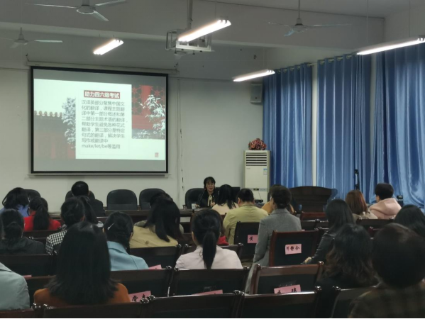肖教授以《翻译中国》课程为例,详细地介绍了《翻译中国》课程的建设目标、特色和建设过程。课程以对接国家战略,加强中译外人才梯队培养,帮助大学生讲好中国故事为目标。课程分为翻译理论和文化主题两部分,包括政治、哲学、国画、书法、小说、戏剧、建筑、中医、美食、服饰和陶瓷等。经过对各大国内外网站、电子图书馆、原版英文书、文化术语库的资料查找,精选内容、多次修改后建成一门完整的适用于大学生的线上学习的翻译课程。肖教授毫无保留地分享了一流课程的建设经验,包括课程视频录制、视频脚本制作、课程材料准备以及后续课程上线要求。之后,肖教授还和参与教研活动的老师们进行了互动,通过答疑环节,老师们深受启发,受益匪浅。