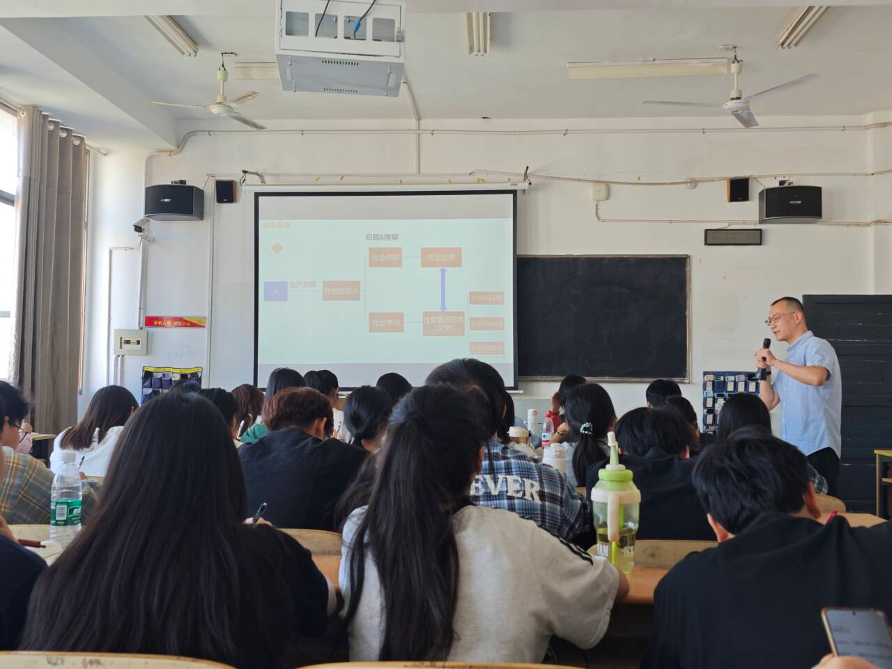 闻滨老师围绕“文学的性质”,讲述“文学是审美的艺术”。审美是人特有的活动。文学作为审美的艺术,主要表现为文学的情感性、形象性与超越性。通过引经据典、案例分析、图文结合、绘制概念关系图表等方法,讲授有理有据,生动有趣,让学生们很好地理解了关于“文学是什么”的基本问题。