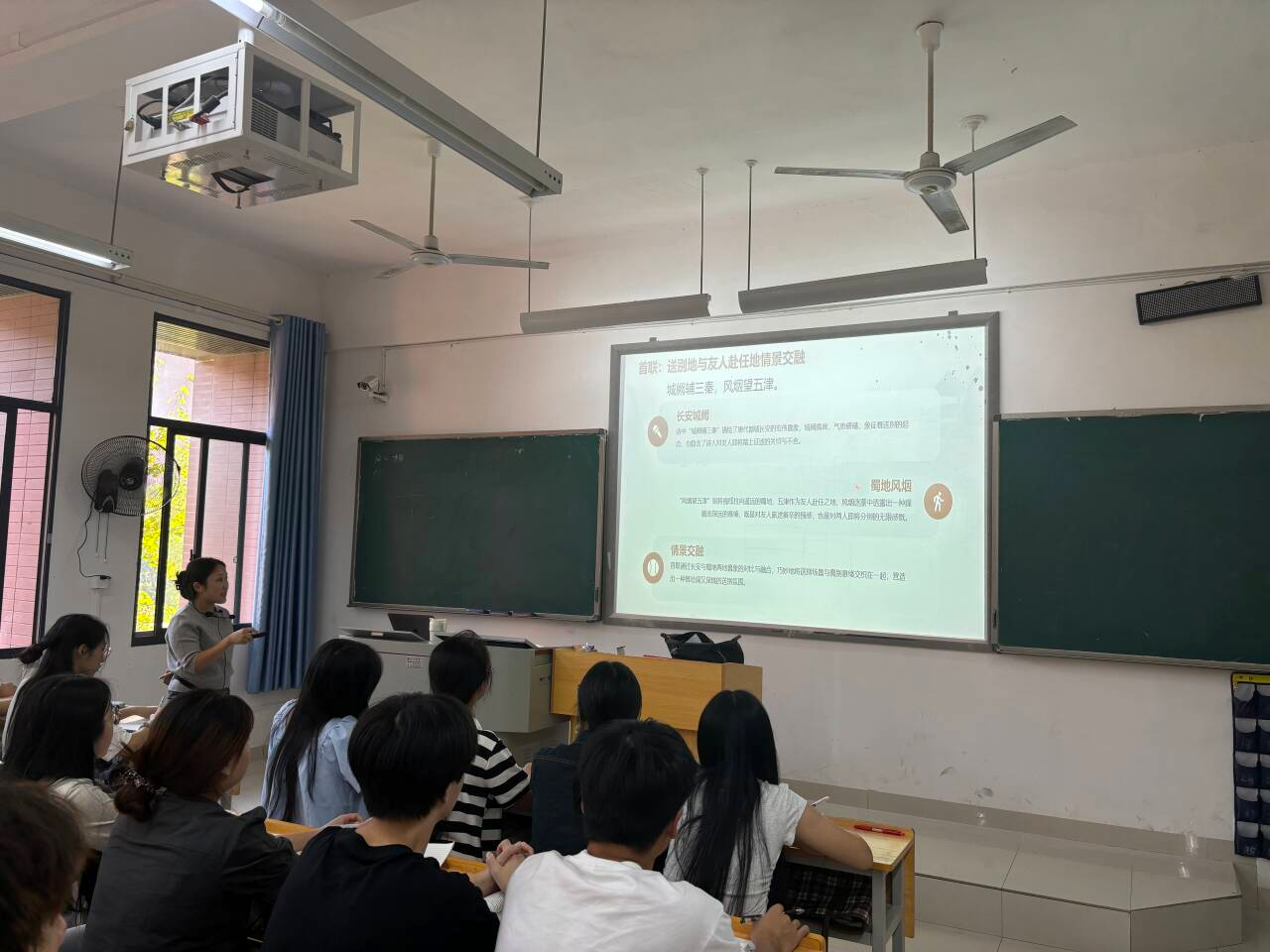 2024年9月25日上午第7节课,杨玲老师在管理楼313教室为2305504班讲述《中国古典诗词》。中文系曾娟、丁珊、罗孝廉、王萍、夏多多、许莲花、张大联、钟应春、燕妮、闻滨、乔鹏、木克然、徐雅琴等老师参与听课。