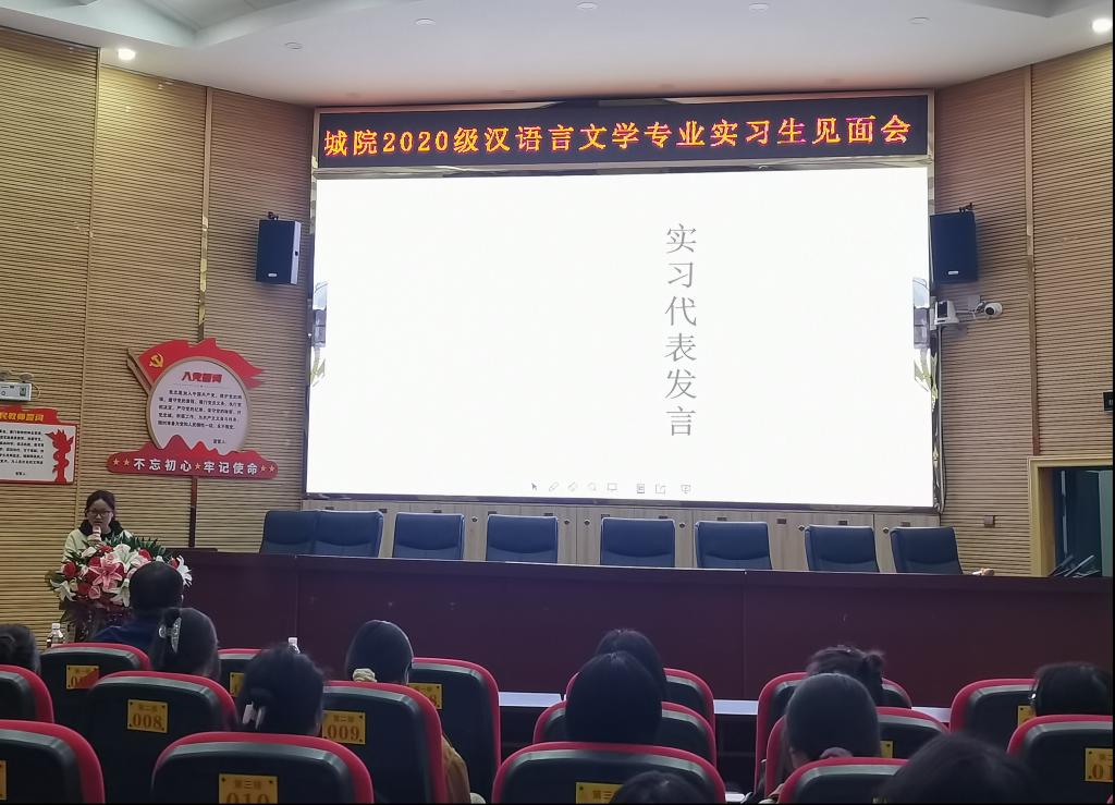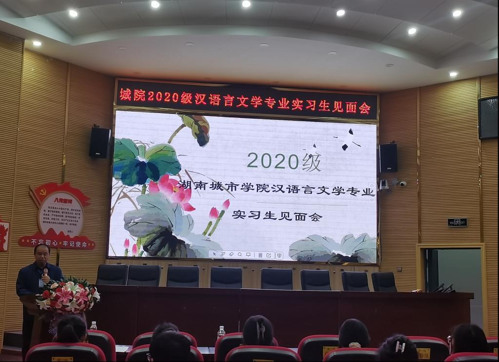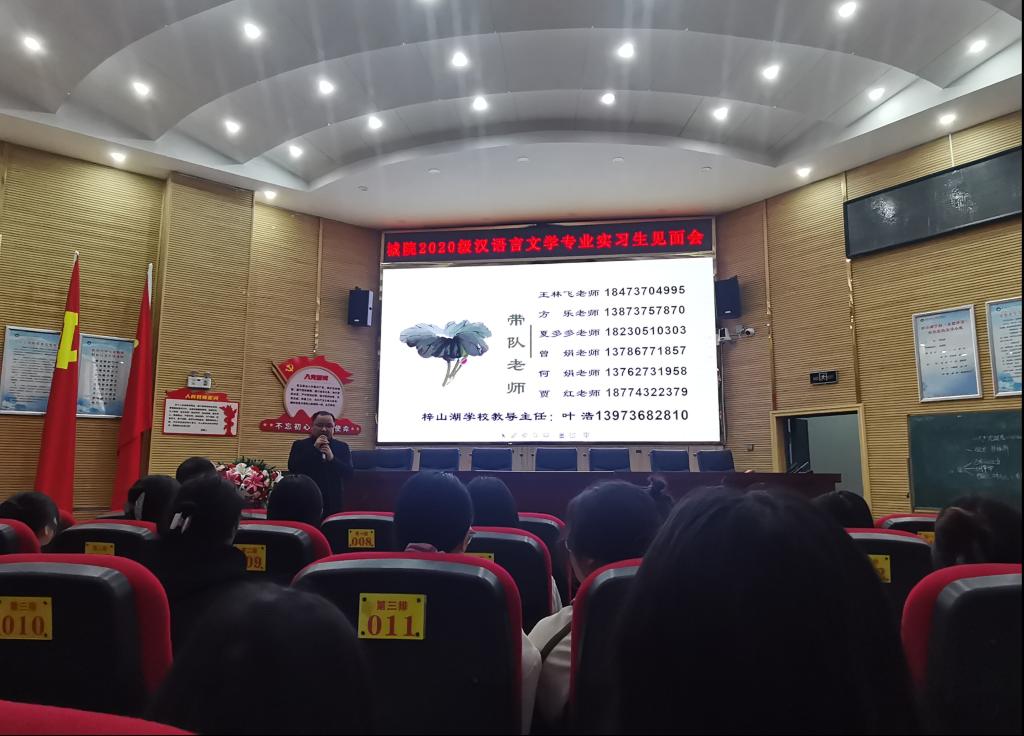 为进一步落实我院学生实习工作,切实提高师范生的教学技能和教育教学水平,3月25日上午,我院汉语言文学专业师生在梓山湖学校报告厅举行实习生见面会。我系带队教师、梓山湖学校教导主任、实习指导教师、班主任及全体实习生参会。