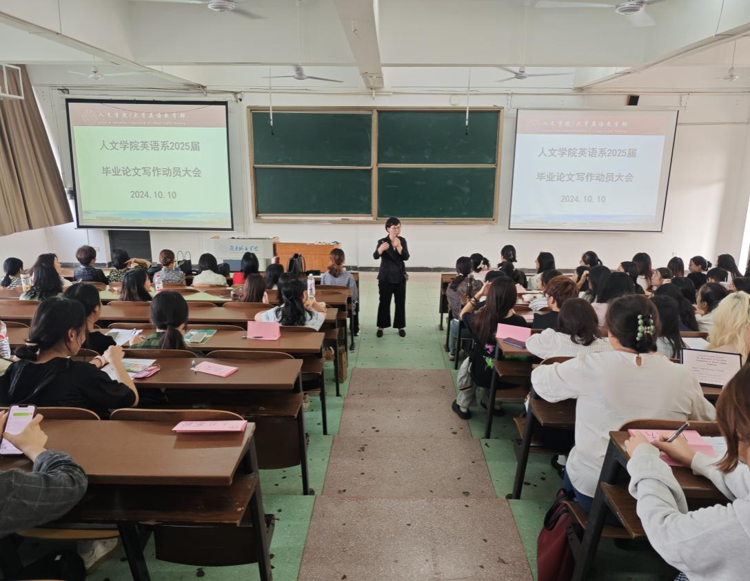 为提高2025届本科毕业论文质量,实现人才培养目标,英语系根据学校关于2025届毕业论文工作指导意见,于10月10日在学校一教学楼408召开了2025届毕业生论文写作动员大会。全体毕业论文指导老师及全体2025届英语系毕业生参加。