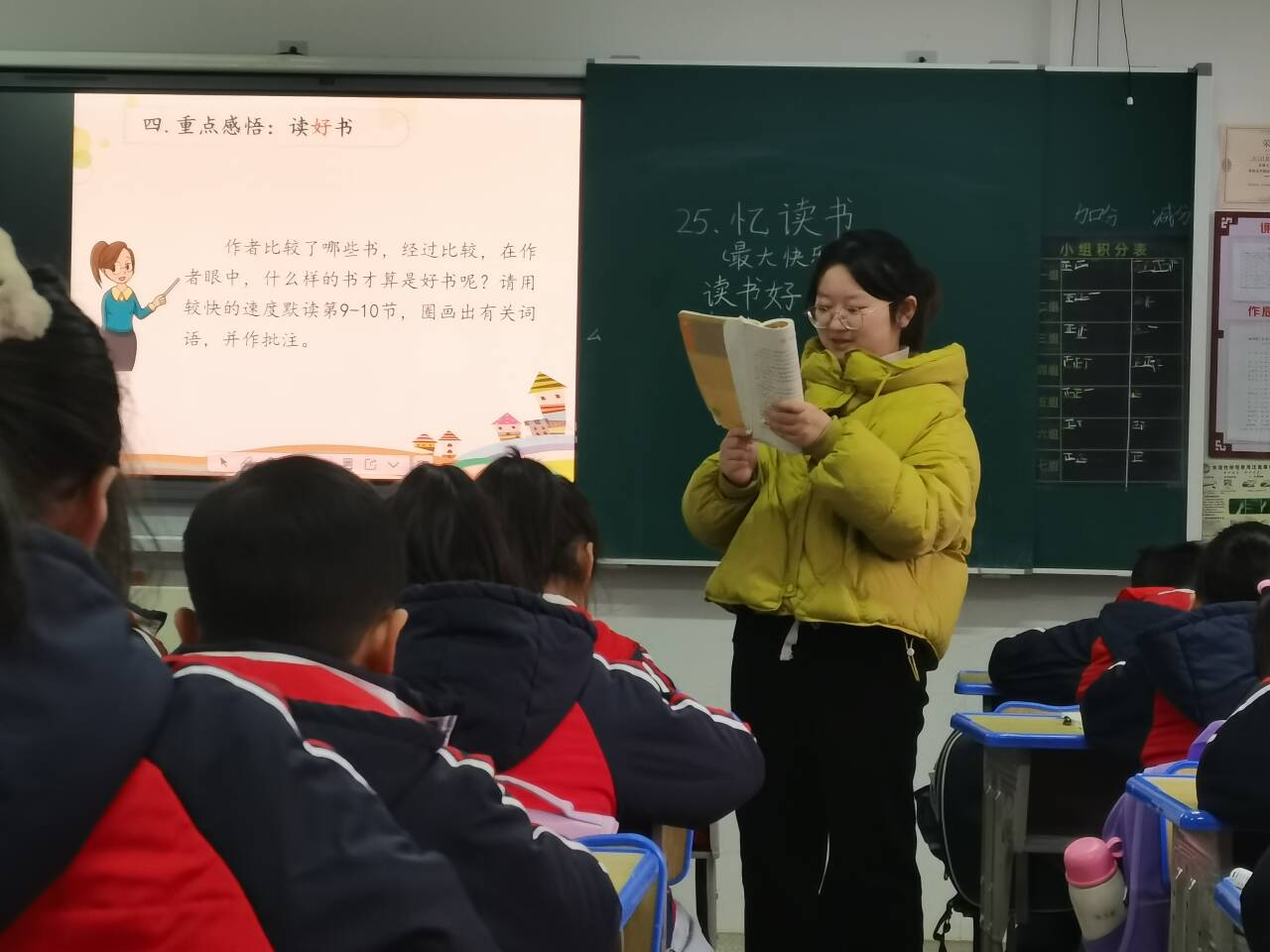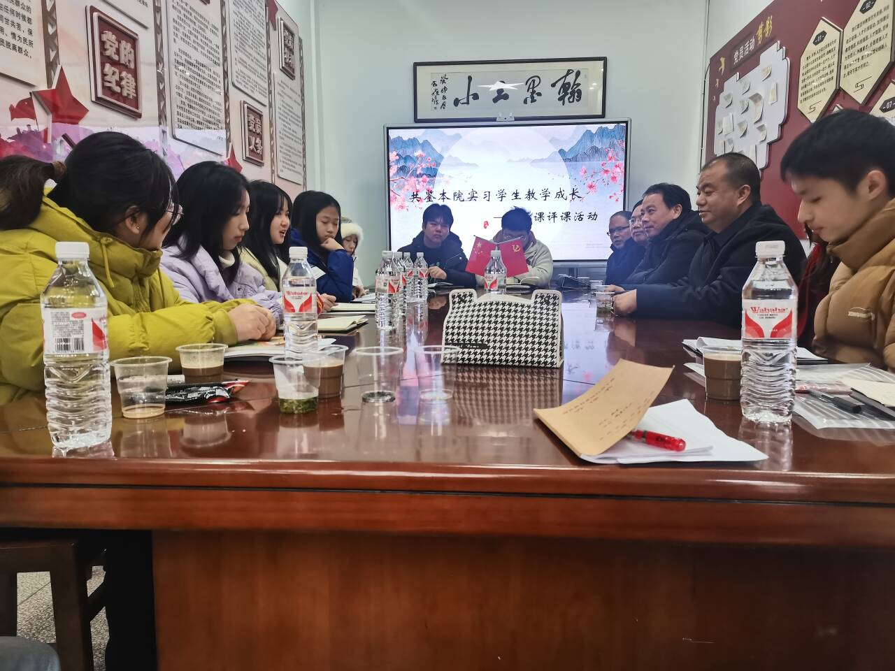 课堂教学观摩环节2105503班涂同学以五年级语文上册《忆读书》为教学内容,在实习班级举行现场公开课汇报。课后参加听课的老师与实习生各抒己见,组织了细致的评课议课活动既肯定了涂涵课堂教学中饱满的教学热情和扎实的专业素养同时也指出了存在的不足,在课程思政、教学重点、学生参与、课堂评价延伸阅读等方面尚有较大提升空间。部分发言人还提到自己亲历教学的经验,为大家提供了有益的参考与借鉴。