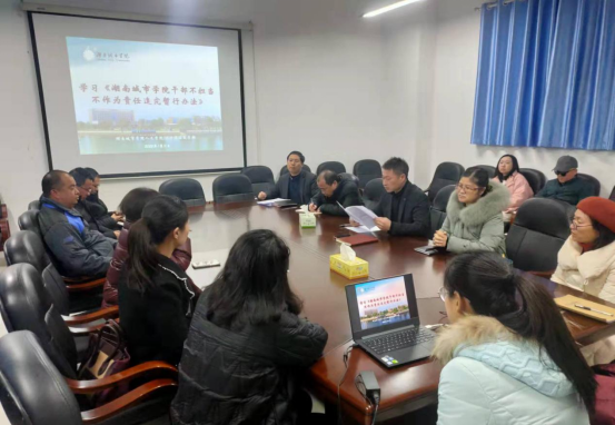 为了全面贯彻从严治党要求,加强干部队伍建设,根据学校党委组织部的安排,2022年1月11日上午,必赢线路检测3003no1/大学英语教学部党委组织学院副科级以上干部、系室中心主任、支部书记、专业负责人在管理楼509集中学习了《湖南城市学院干部不担当不作为责任追究暂行办法》,对干部不担当不作为追究责任的十五个方面进行了重点讲述,强调实行干部不担当不作为“一岗三责”,对干部们提出了相应的要求,切实履行职责,勇于承担责任。