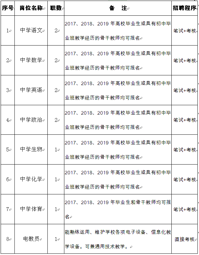 中学语文、中学数学、中学英语、中学政治、中学生物、中学化学、中学体育岗位考试由笔试和考核组成;电教员岗位仅设置直接考核环节。