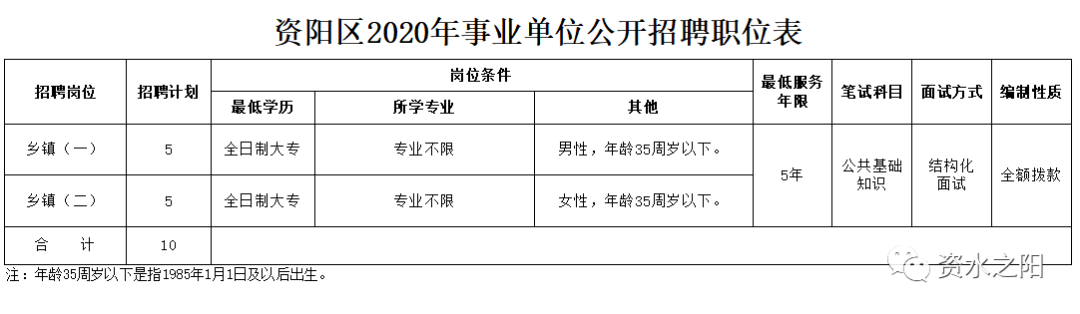 本次计划公开招聘乡镇事业单位工作人员10名,具体招聘职位详见《益阳市资阳区2020年事业单位招聘职位表》(附件1)。