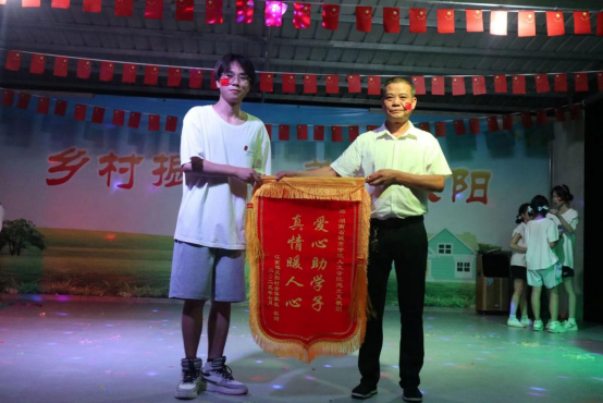 图为庆阳村村支书陶军良为感光支教团颁发锦旗。