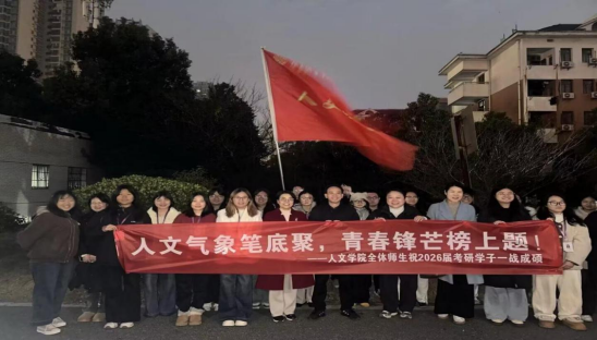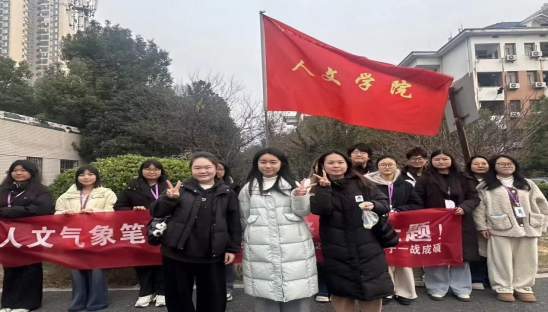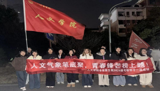 送考现场,一条写有“人文气象笔底聚,青春锋芒榜上提”的横幅迎风招展,格外醒目。由学院学生干部自发组成的助威队伍手持励志标语牌,齐声高喊“笔落书胸臆,旗开耀锦程!”、“人文学子,未来可期!”等口号。铿锵有力的呐喊声驱散了冬日的寒意,为即将步入考场的学子注入了强大的精神动力。