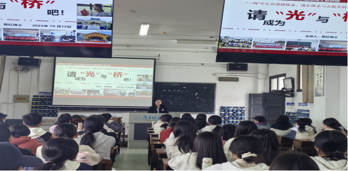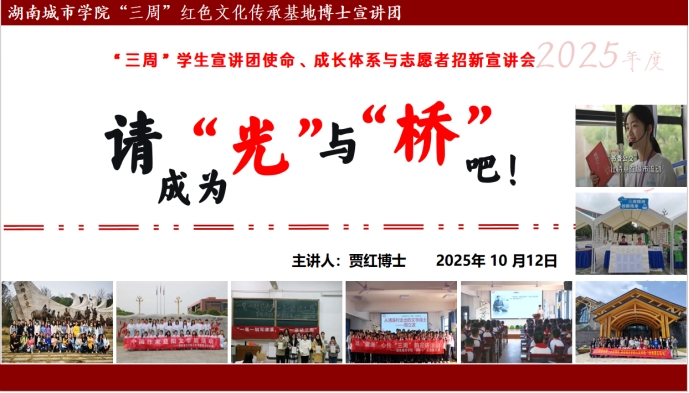 2025年10月12日,“三周”红色文化传承基地执行主任贾红博士以《请成为“光”与“桥”吧:红色文化传承中的我们》为题,向2025级新生开展主题宣讲,系统阐释基地学生宣讲团的使命愿景、成长体系与2026年度招新计划。